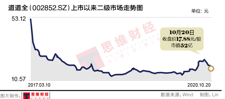 今年以来,道道全股价多在20元/股(前复权,下同)以下,市值约60亿元左右。对比公司在2017年3月上市之初,如今股价已经腰斩。彼时,股价在连续涨停后,不到半个月就达到50元/股的高点,市值突破155亿元。